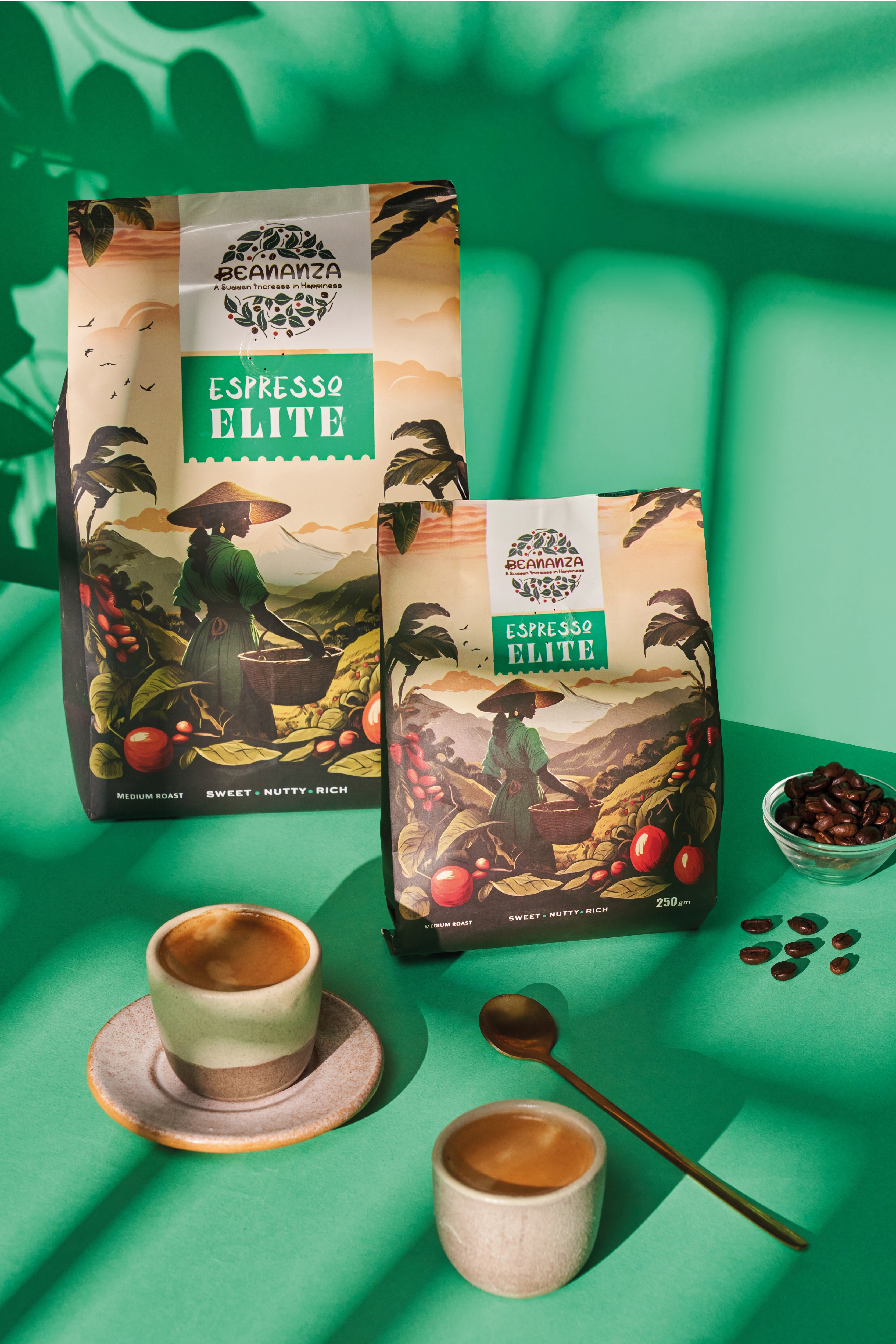 بتحميص متوسط، تتميز هذه التوليفة بقوام ناعم ومرارة منخفضة مع طبقات نكهات غنية تشمل الشوكولاتة الداكنة، المكسرات، الفواكه الاستوائية، ولمسة من الحلاوة الحمضية.